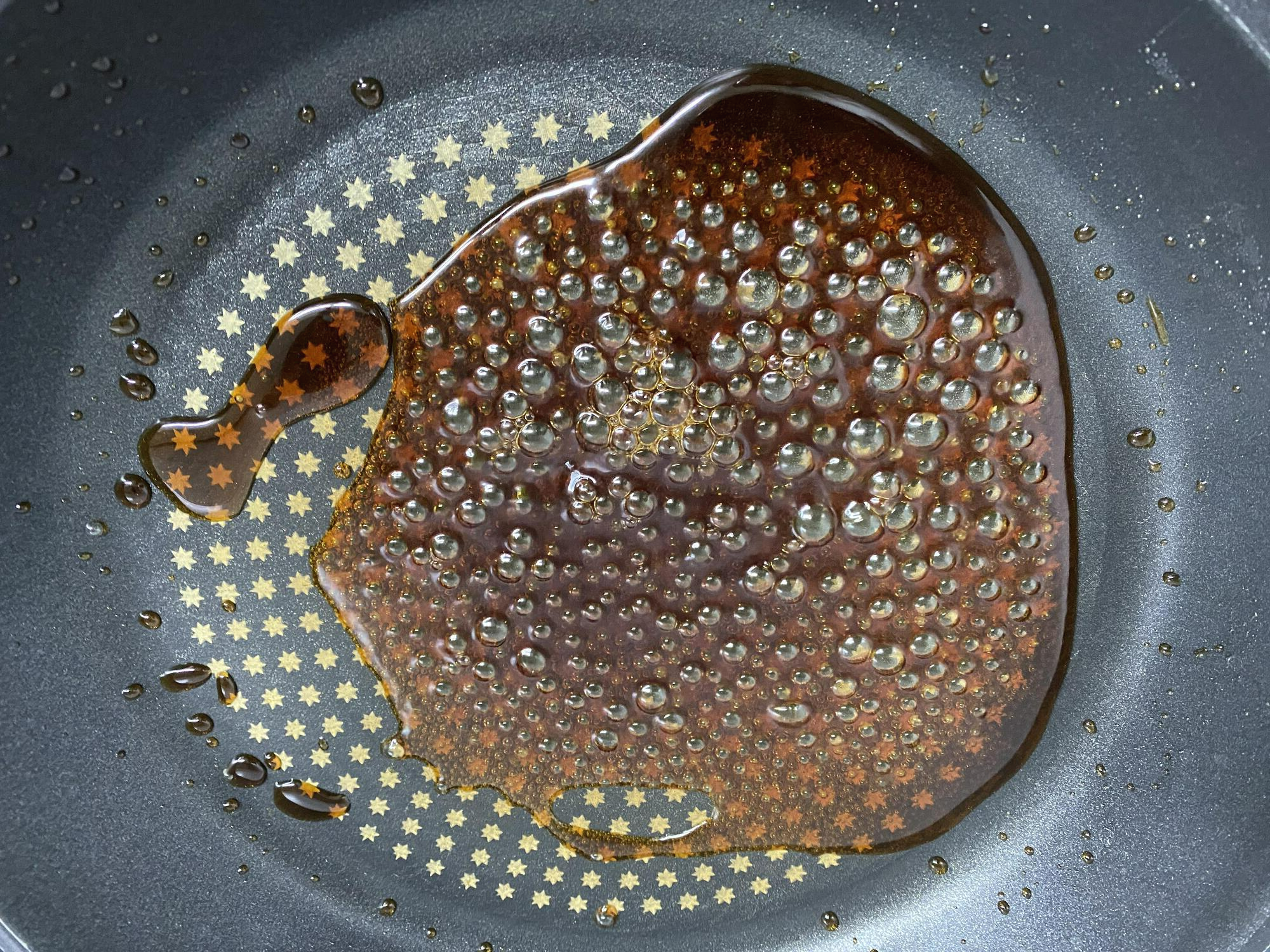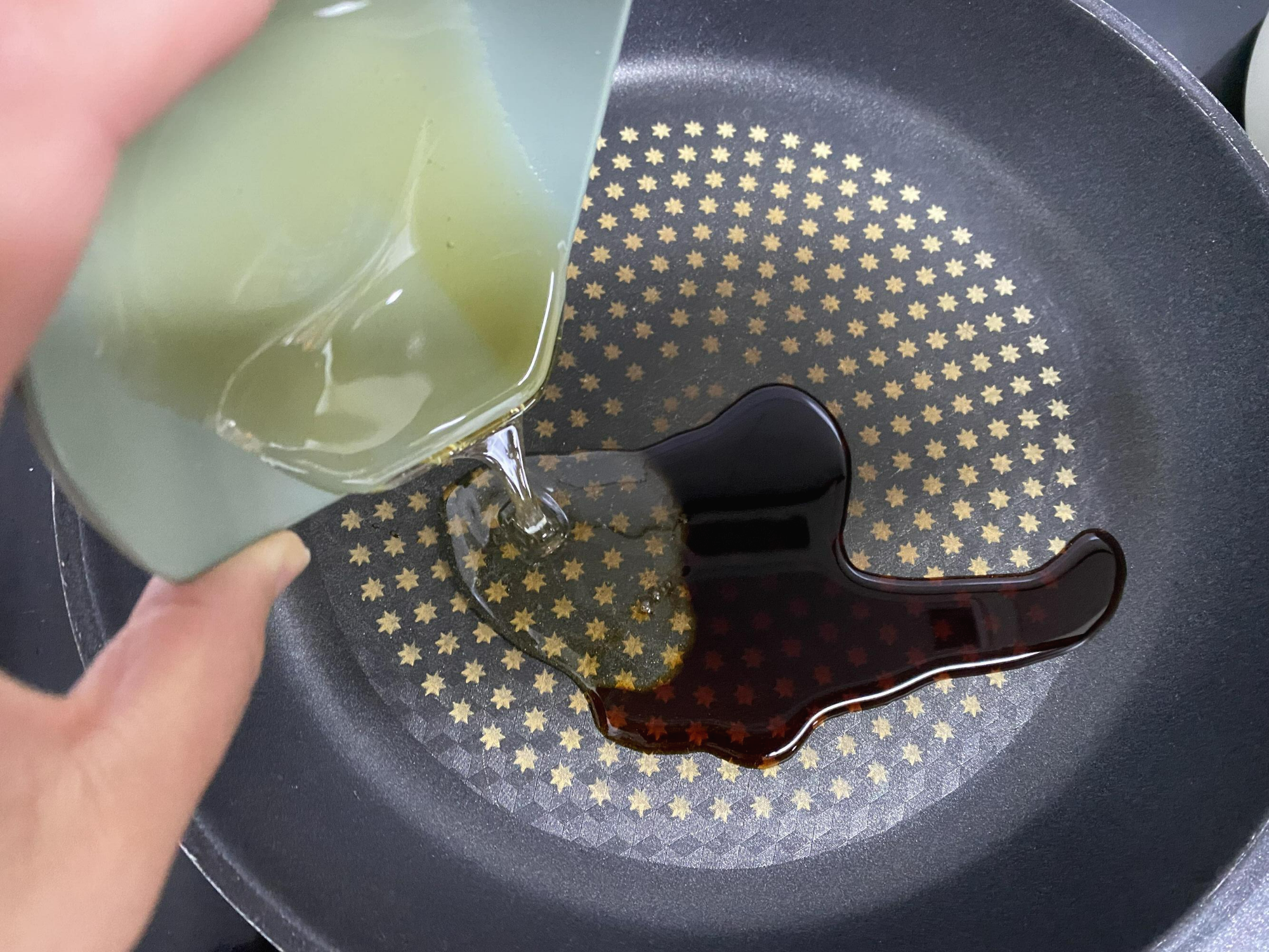 4. 간장 3큰술과 올리고당 3큰술을 중불로 킨 프라이팬에 넣어준다.
