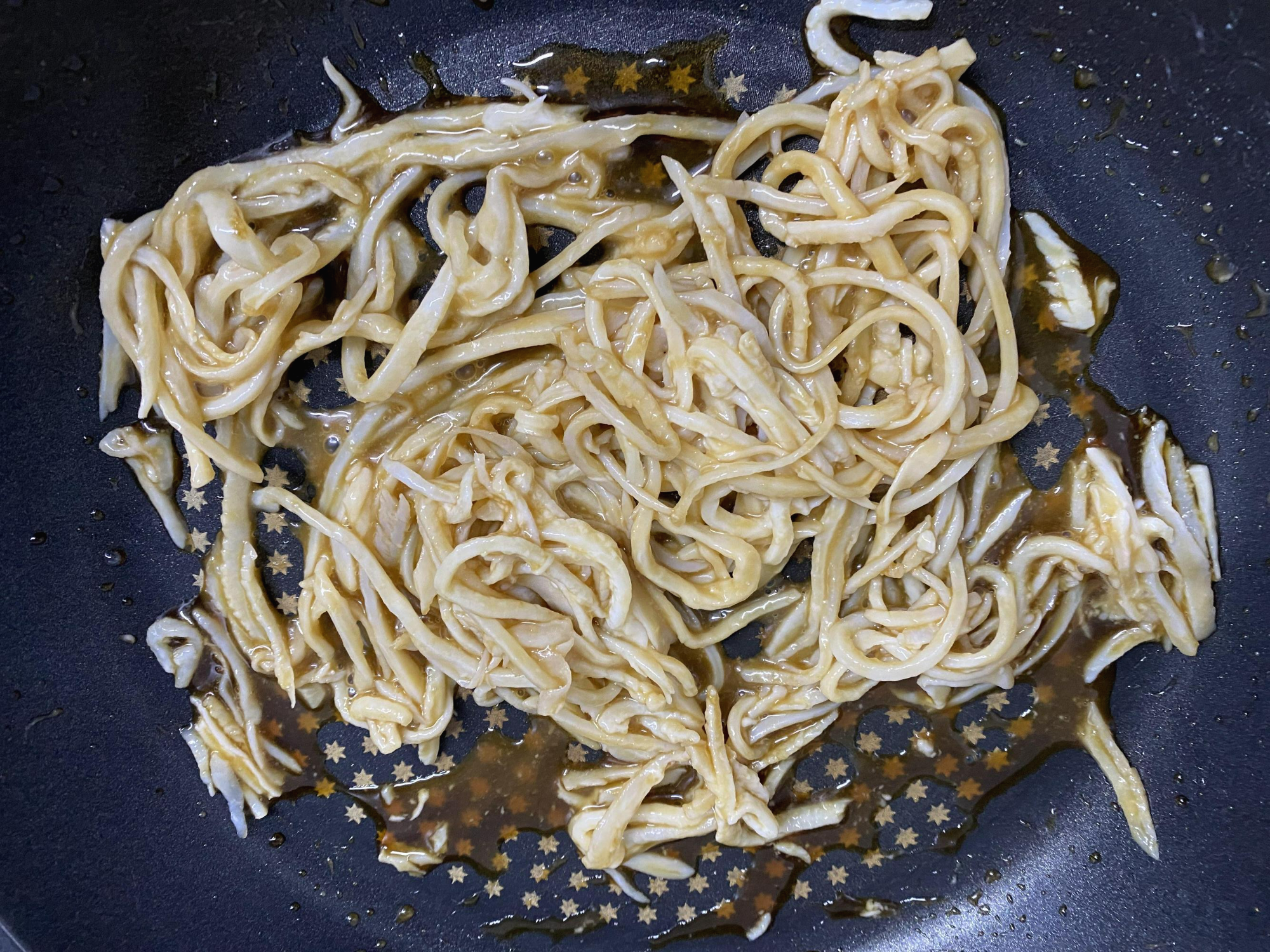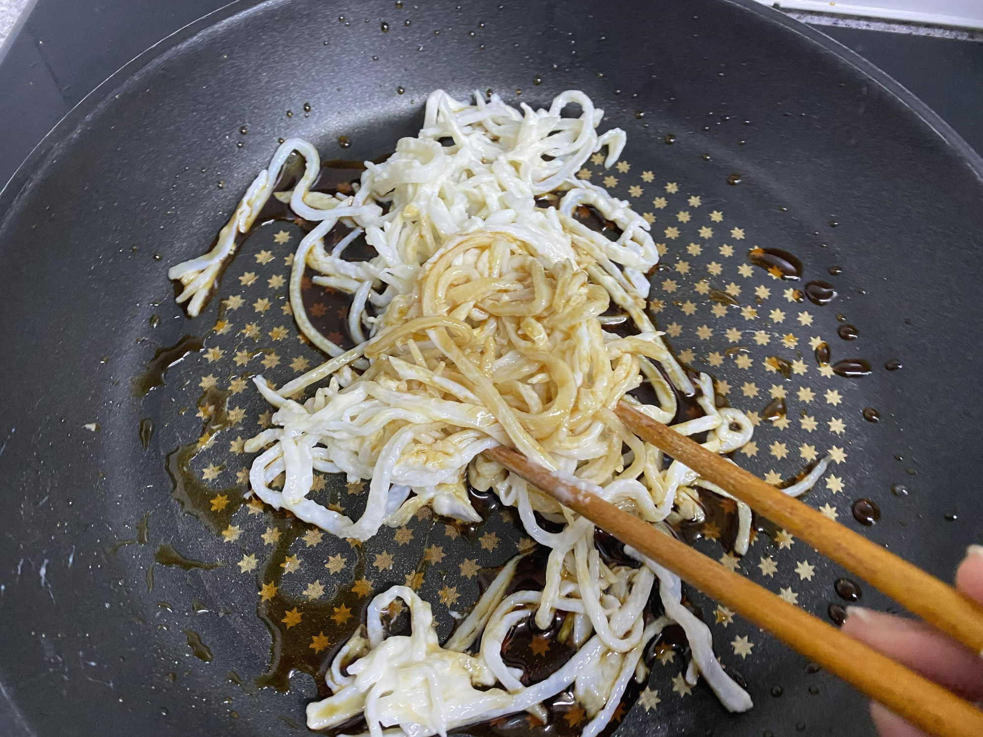 4. 졸여진 양념에 마요네즈를 버무려준 진미채를 넣어 같이 섞어 볶아준다.
